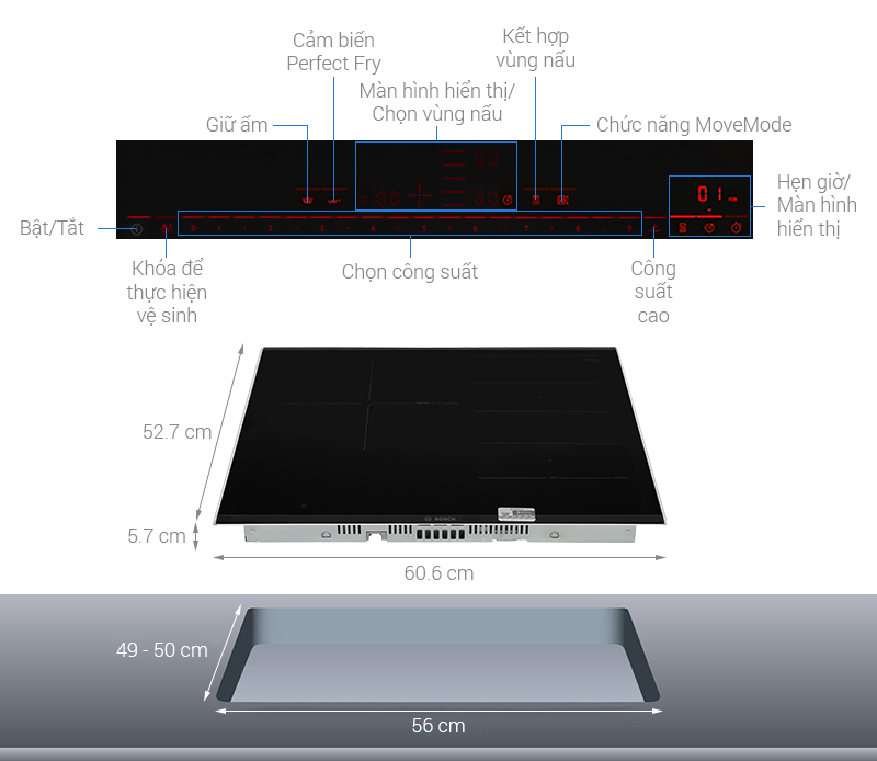 • Loại bếp : Bếp từ 3 vùng nấu, Bếp âm cần lắp CB