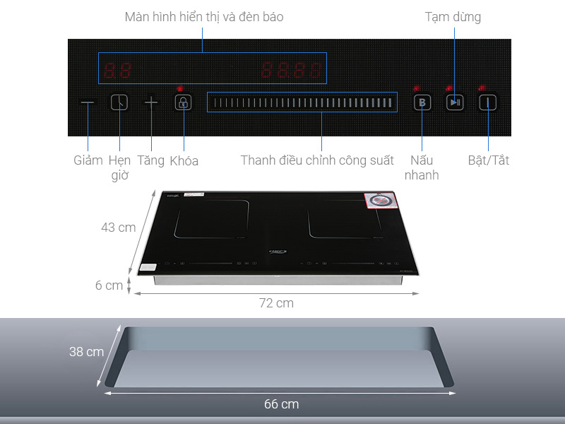 • Kích thước vùng nấu : Trái: Ø 14/20 cm – Phải: Ø 20 cm