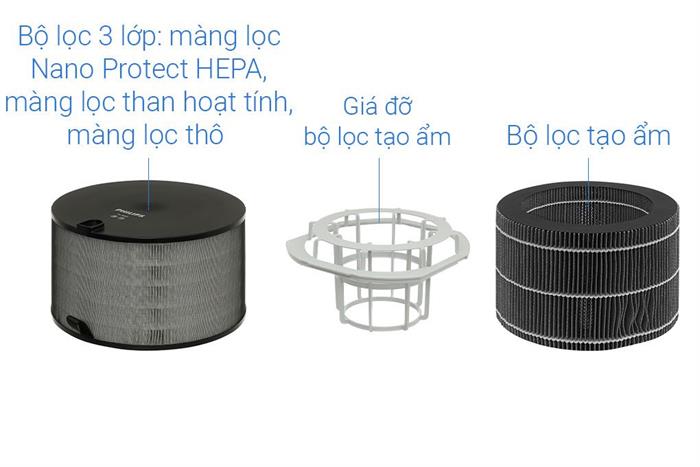 • Bộ lọc 3 lớp (Màng lọc Nano Protect HEPA – Màng lọc than hoạt tính – Màng lọc thô)