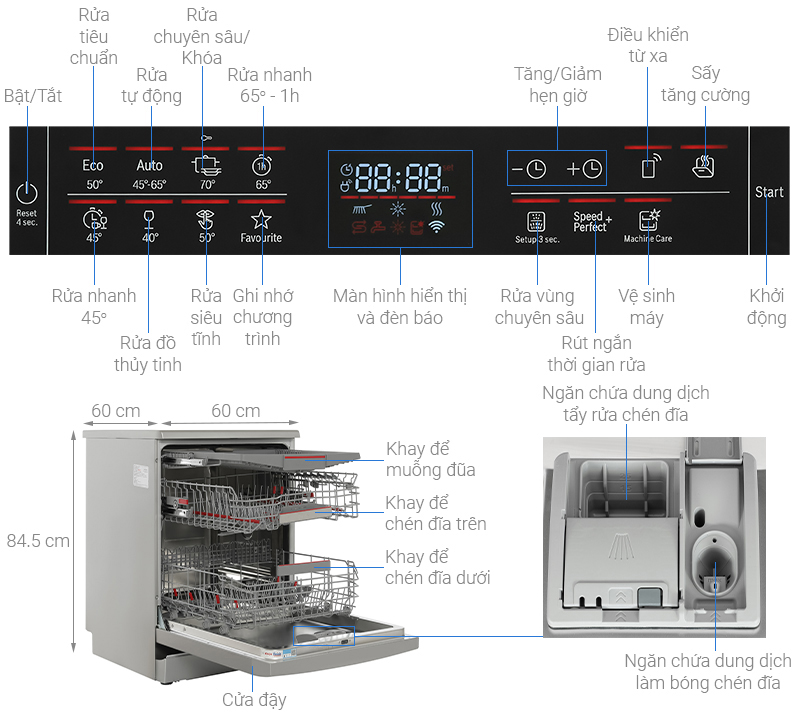 Số chén bát rửa được : 3 – 4 bữa ăn Việt (13 bộ Châu Âu)