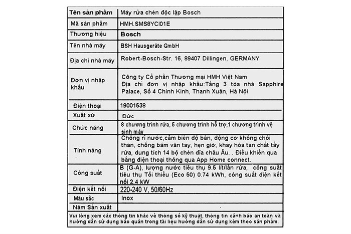 Tiêu thụ nước : ~ 9.5 lít/lần rửa