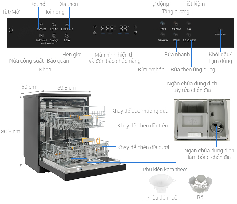 • Kích thước – Khối lượng : Cao 80.5 cm – Ngang 59.8 cm – Sâu 60 cm – Nặng 47 kg