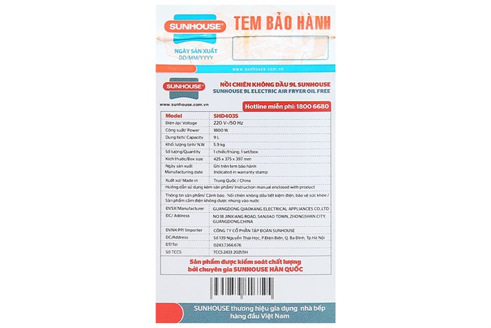 Nồi chiên không dầu Sunhouse SHD4035 9 lít