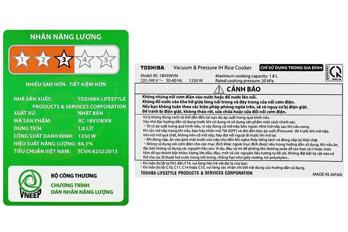 Nồi cơm áp suất cao tần Toshiba 1.8 lít RC-18VXWVN(W)