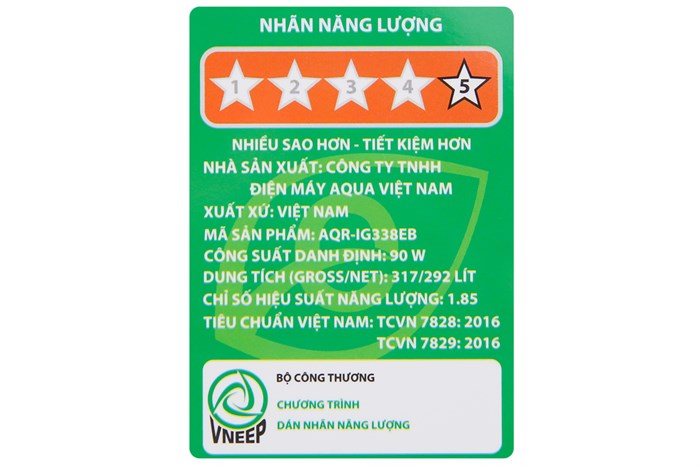 • Công suất tiêu thụ công bố theo TCVN : 54007 kWh/năm
