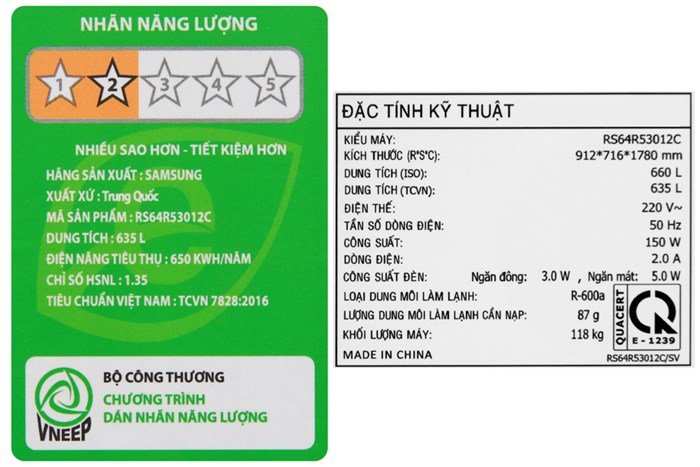 • Công suất tiêu thụ công bố theo TCVN : 650 kWh/năm